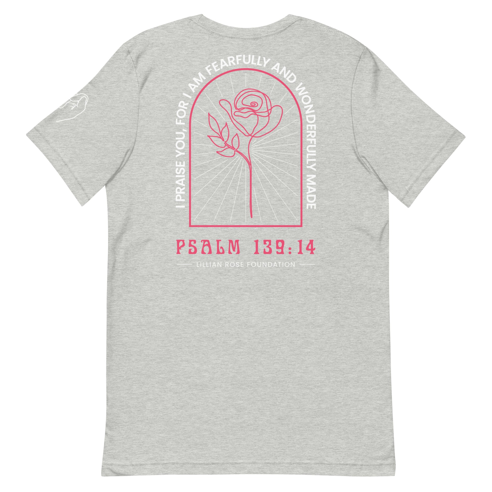 This tone on tone tee features the foundation letters on the front and our staple verse “fearfully and wonderfully made” on the back.